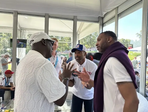 9月29日讯 今日,NBA传奇球星迈克尔-乔丹、卡梅隆-安东尼、特雷西-麦克格雷迪、文斯-卡特和布莱恩-斯卡拉布赖恩现身贝斯佩奇黑球场,参加莱德杯第三天的比赛!