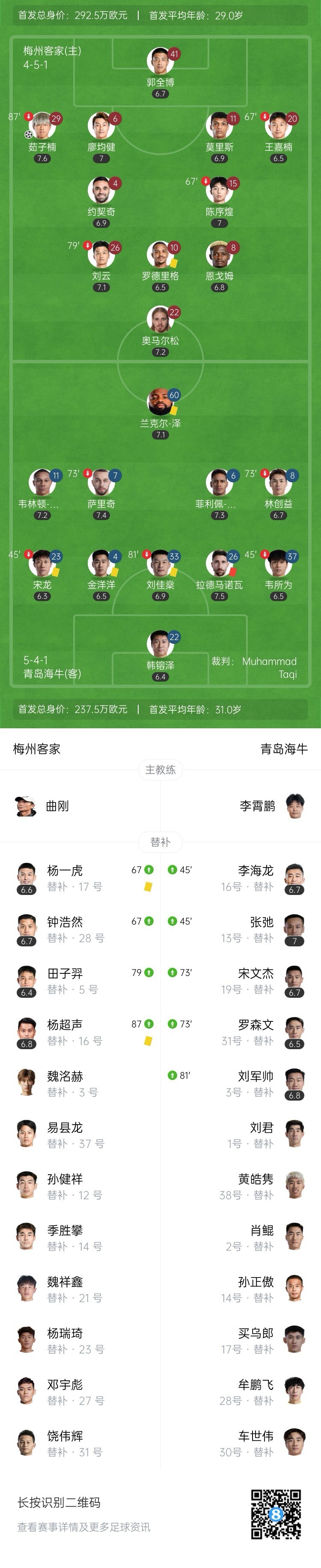 全场比赛结束,梅州客家1-0击败青岛海牛。