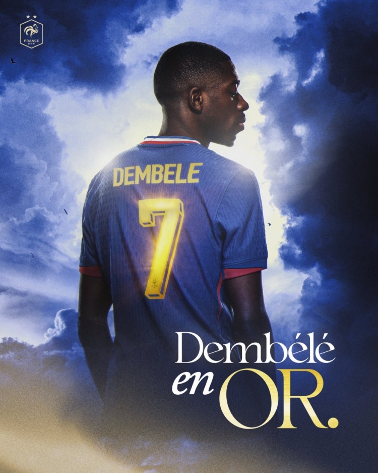 9月24日讯 2025年金球奖颁奖典礼完美落幕,法国前锋登贝莱最终问鼎本年度金球奖。法国国家队官方随即推出了以登贝莱为主题的 “金球版球衣”,以庆祝这位巴黎圣日耳曼球星荣获2025年度金球奖。